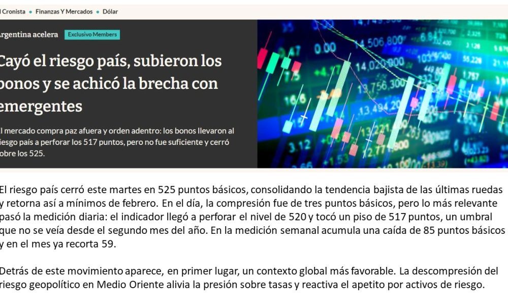El riesgo país cerró este martes en 525 puntos básicos, consolidando la tendencia bajista de las últimas ruedas y retorna así a mínimos de febrero. En el día, la compresión fue de tres puntos básicos, pero lo más relevante pasó la medición diaria: el indicador llegó a perforar el nivel de 520 y tocó un piso de 517 puntos, un umbral que no se veía desde el segundo mes del año. En la medición semanal acumula una caída de 85 puntos básicos y en el mes ya recorta 59.