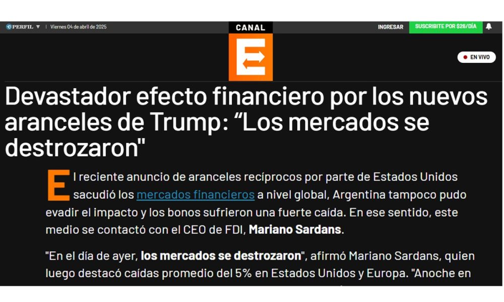 El reciente anuncio de aranceles recíprocos por parte de Estados Unidos sacudió los mercados financieros a nivel global, Argentina tampoco pudo evadir el impacto y los bonos sufrieron una fuerte caída. En ese sentido, este medio se contactó con el CEO de FDI, Mariano Sardans.