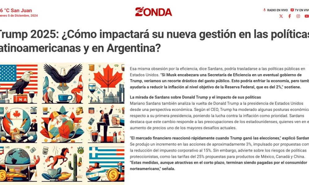 Mariano Sardáns también analiza la vuelta de Donald Trump a la presidencia de Estados Unidos desde una perspectiva económica. Según el CEO, Trump ha moderado algunas posturas económicas respecto a su primera presidencia, poniendo la lucha contra la inflación como prioridad. Sardans destaca que este cambio responde a las preocupaciones de los estadounidenses, quienes ven en el aumento de precios uno de los mayores desafíos actuales.