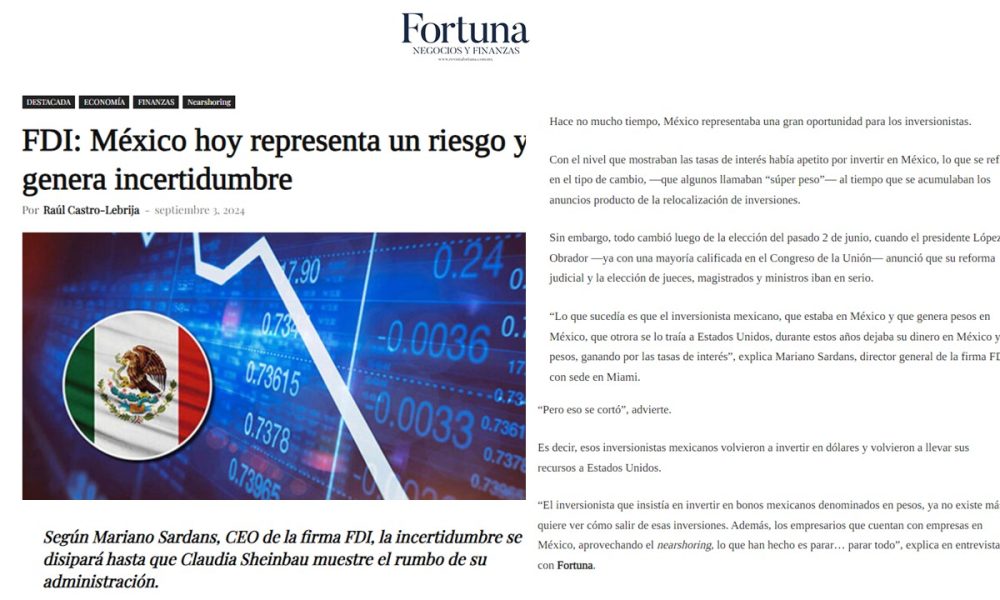 “El inversionista que insistía en invertir en bonos mexicanos denominados en pesos, ya no existe más; quiere ver cómo salir de esas inversiones. Además, los empresarios que cuentan con empresas en México, aprovechando el nearshoring, lo que han hecho es parar… parar todo”, explica en entrevista con Fortuna.