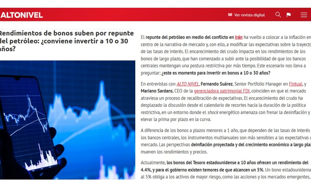 En entrevistas con ALTO NIVEL, Fernando Suárez, Senior Portfolio Manager en Fintual, y Mariano Sardans, CEO de la gerenciadora patrimonial FDI, coinciden en que el mercado atraviesa un proceso de recalibración de expectativas. El encarecimiento del crudo ha desplazado la discusión desde el calendario de recortes hacia la duración de la política restrictiva, en un entorno donde el shock energético amenaza con frenar la desinflación y elevar la prima por plazo en la curva.