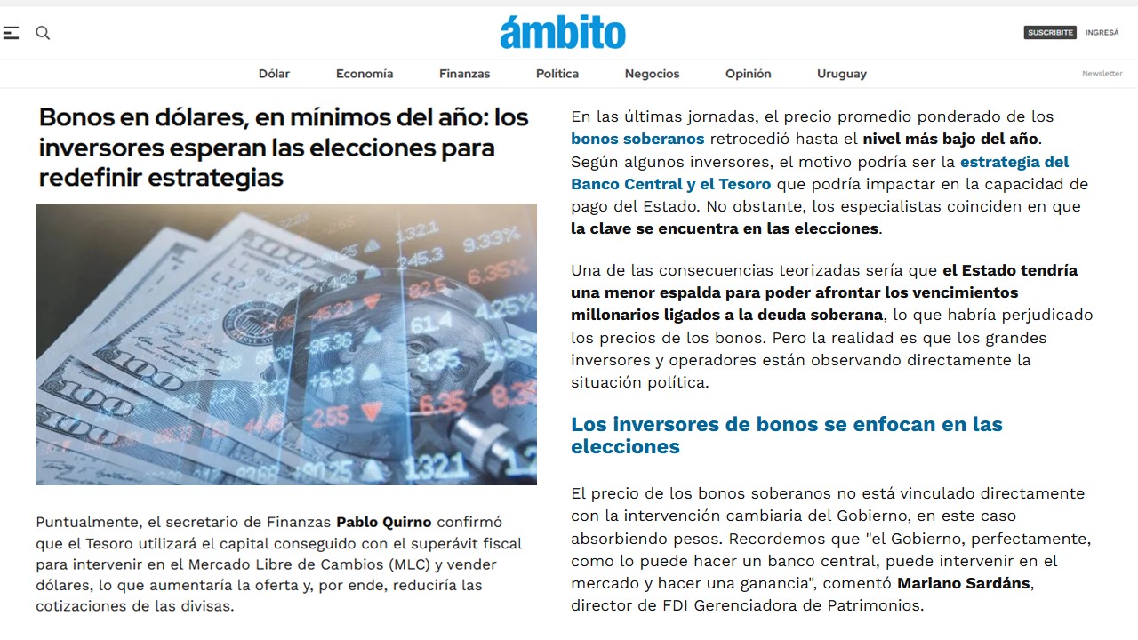 Por su parte, los analistas de Proficio Investment detallaron que, en un escenario positivo, debería existir una normalización del mercado de bonos en pesos, con las tasas descendiendo tras meses de estrés, considerando que faltaría más de un mes para las elecciones nacionales.