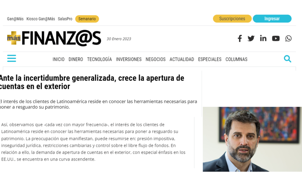 Así, observamos que -cada vez con mayor frecuencia-, el interés de los clientes de Latinoamérica reside en conocer las herramientas necesarias para poner a resguardo su patrimonio. La preocupación que manifiestan, puede resumirse en: presión impositiva, inseguridad jurídica, restricciones cambiarias y control sobre el libre flujo de fondos. En relación a ello, la demanda de apertura de cuentas en el exterior, con especial énfasis en los EE.UU., se encuentra en una curva ascendente.