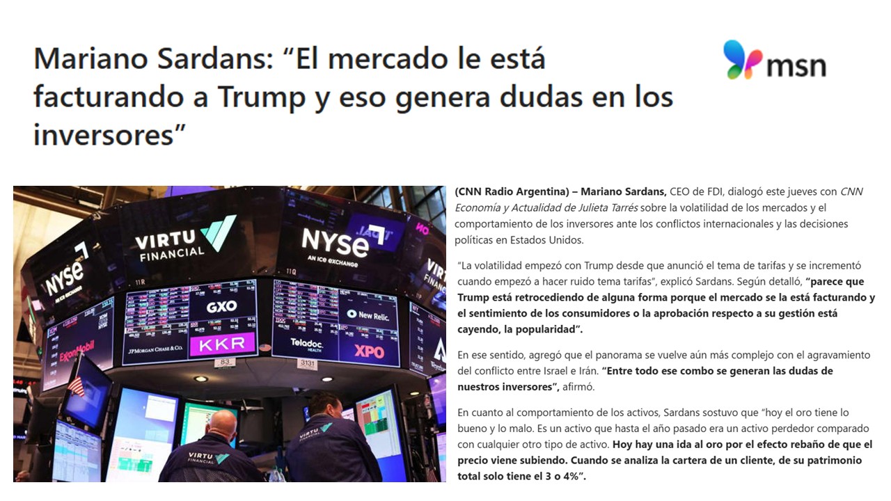 (CNN Radio Argentina) – Mariano Sardans, CEO de FDI, dialogó este jueves con CNN Economía y Actualidad de Julieta Tarrés sobre la volatilidad de los mercados y el comportamiento de los inversores ante los conflictos internacionales y las decisiones políticas en Estados Unidos.