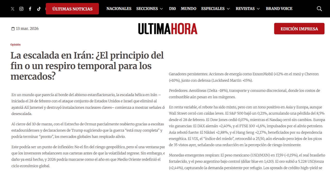 Este podría ser un punto de inflexión: No el fin del riesgo geopolítico, pero sí una ventana para que los inversores rebalanceen sus carteras antes de que la volatilidad regrese. Sin embargo, el daño ya está hecho, y 2026 podría marcarse como el año en que Medio Oriente redefinió el ciclo económico global.