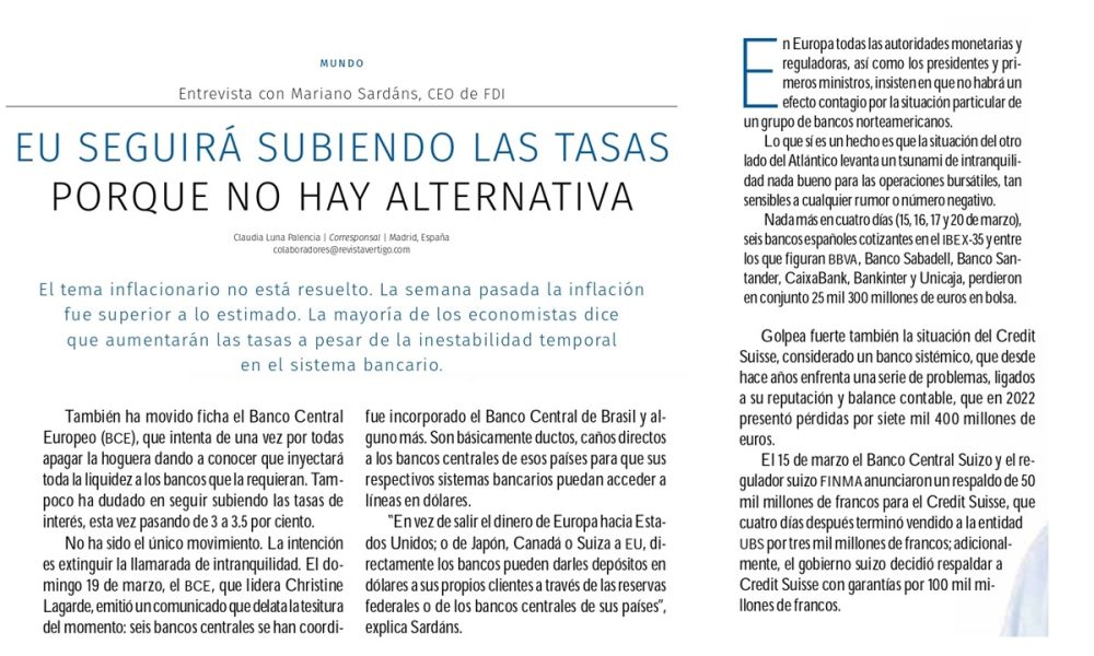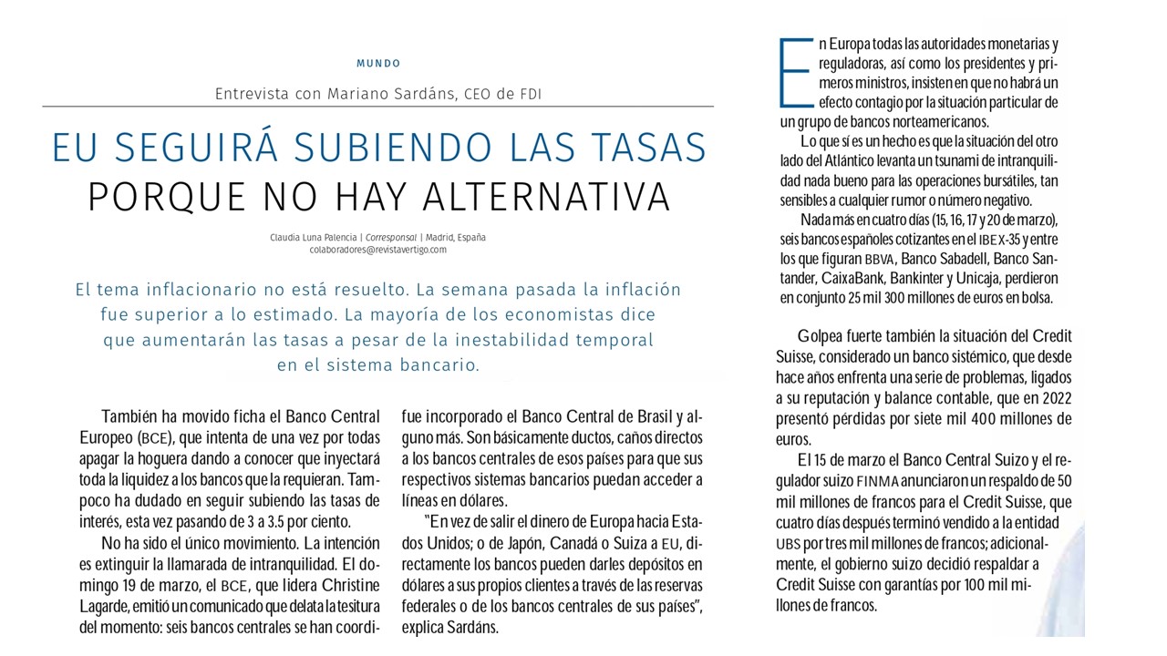 Sardáns, quien estudió en la Universidad de Berkeley y vivió varios años en EU, dirige una firma orientada al tema de la gestión de los patrimonios con varias bifurcaciones no solo en su sede, Uruguay, sino también por América Latina, EU y Europa. Y dice convencido a Vértigo que la política monetaria en EU seguirá con el ajuste alcista en las tasas de interés a pesar del reciente ruido en el sistema bancario, porque hay que bajar la inflación.